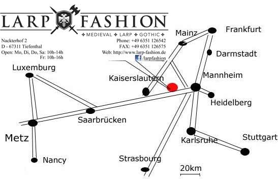 Du kannst uns auch direkt einen Besuch abstatten und dir unsere Auswahl an Mittelalterkleidung und LARP Kleidung präsentieren lassen.
